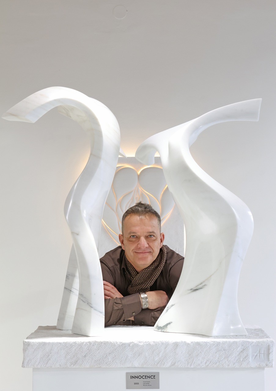 Alexander Hohla brings together the precision of a physicist and the intuition of an artist. His transition from experimental physics to sculpture is a story of reinvention, one that reflects a deep curiosity about structure, light, and material. After years working with lasers and studying the behavior of light, he turned to marble, a medium that allows him to explore form in a tangible, enduring way.